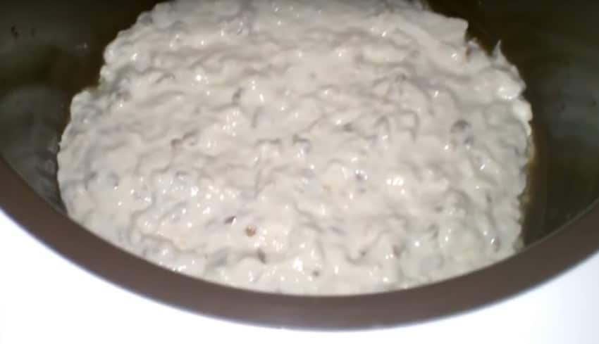 - Далее необходимо взять чашу мультиварки и тщательно промазать ее маслом со всех сторон, уложить туда готовый замес и нажать на опцию «Подогрев» на 5 минут.