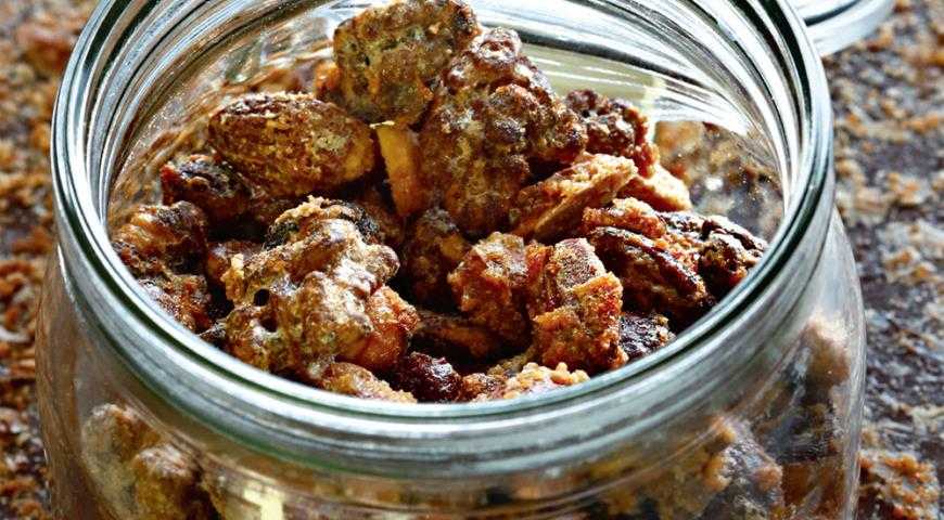 Застелите противень бумагой для выпечки. Распределите орехи в один слой, разровняйте и поставьте противень в духовку на 30 мин. Во время приготовления несколько раз перемешайте орехи на противне. Достаньте противень из духовки и полностью остудите орехи. Переложите в банку с плотной крышкой. Хозяйке на заметку Сладкие орешки в пряной глазури – прекрасное дополнение к кофе или к чаю. Крошкой из них можно посыпать кашу, творог, йогурт, тем самым обогатив вкус блюда и добавив ему сытности. Да и просто перекусить горсткой таких орешков – одно удовольствие.