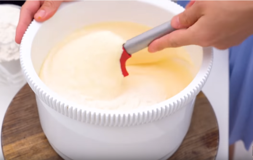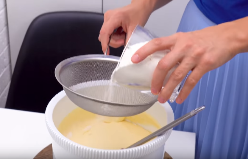 - В эту смесь насыпьте просеянную на сито пшеничную муку, добавьте щепотку пищевой соды и еще раз взбейте до консистенции густой сметаны.