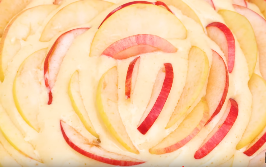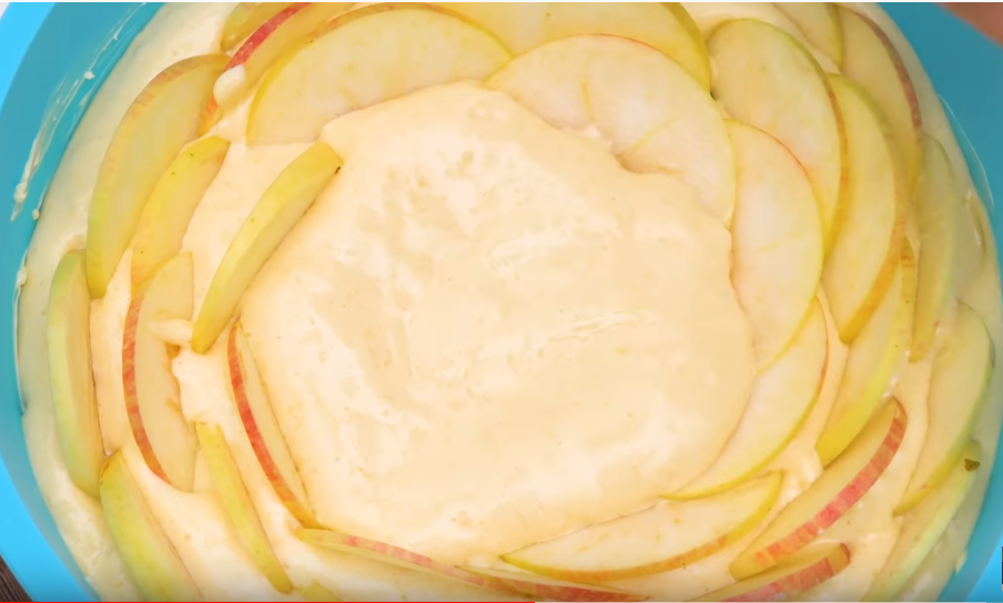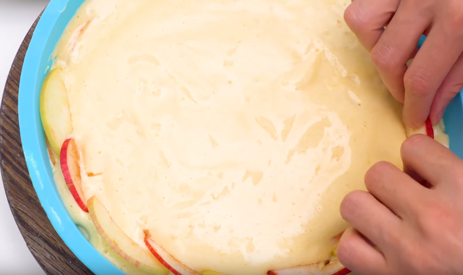 Выложите на него подготовленные яблоки. На них налейте оставшееся тесто и форму немного встряхните. От этого яблоки равномерно распределятся по всему тесту.