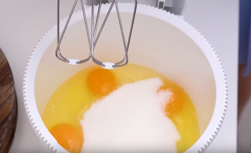 - В отдельную емкость вбейте два куриных яйца, добавьте к ним необходимое количество сахара и немного соли и с помощью венчика или миксера взбейте в пышную массу.