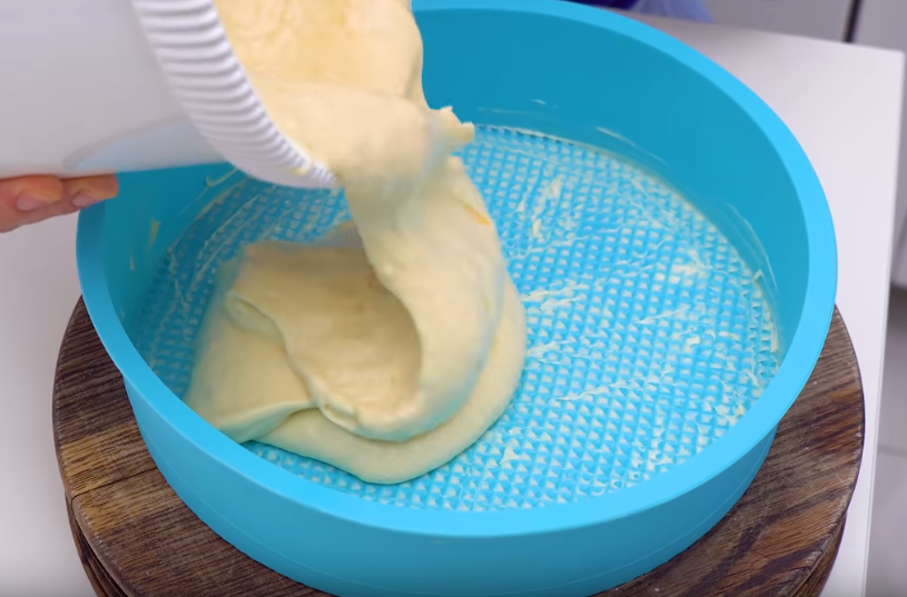 5. Готовим форму — разъемную застилаем бумагой для выпечки, силиконовую (как у нас) смазываем маслом. Выливаем на дно формы половину теста.