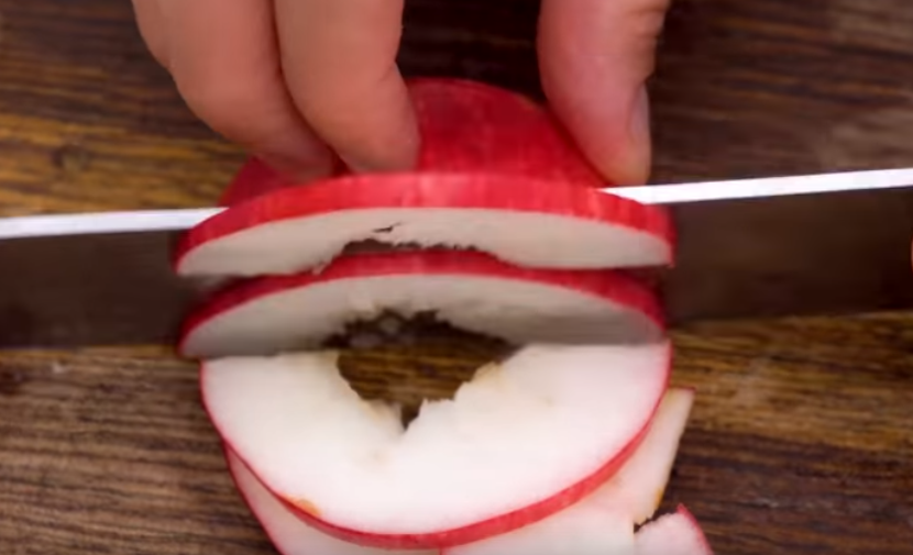 6. Яблочки промойте в проточной воде, а затем нарежьте аккуратными пластинками. Удалите косточки и плодоножки.