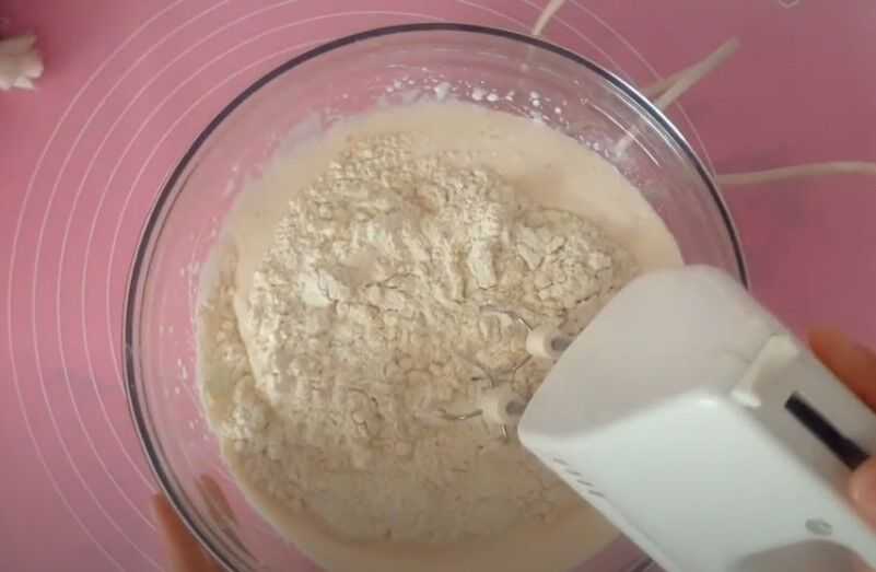3. Затем добавляем муку и разрыхлитель, заранее просеяв через сито.