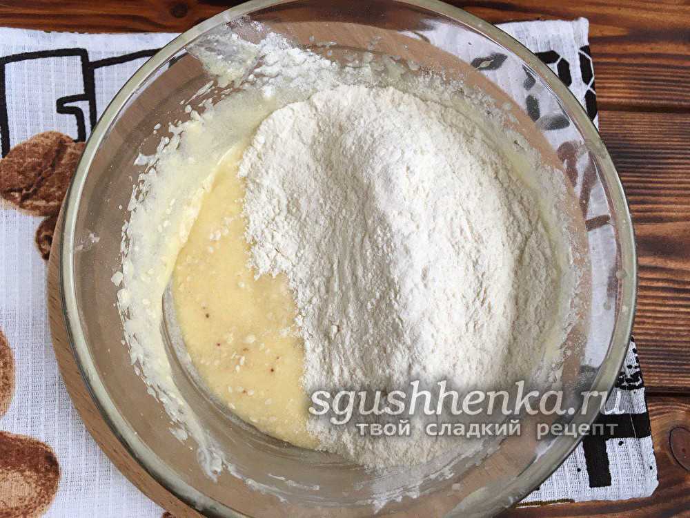 Постепенно всыпать муку, смешанную с разрыхлителем.