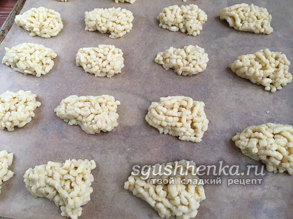 Выстуженное тесто (отламывая от «колобка» кусочки удобной величины) пропустить через мясорубку (через специализированную фигурную насадку для печенья или обычную – для мяса). Сформировать из «фарша» желаемые фигурки (лепестки, треугольники, квадраты, полумесяцы).