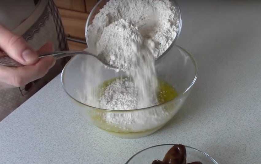 - В эту емкость добавьте сухую смесь из муки, сахара, отрубей и хлопьев геркулеса, замесите руками плотное тесто.