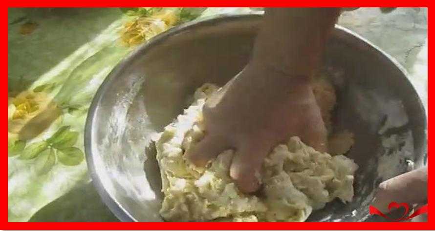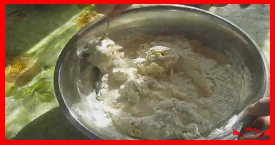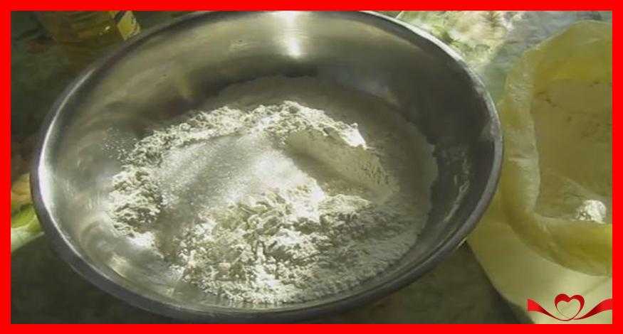 12. На него посыпьте 0,5 стакана муки. И вымешивайте тесто. Тесто придется вымешивать с усилием и даже будет казаться, что уже получилась крошка, но вы должны вымесить тесто в тугой шар.
