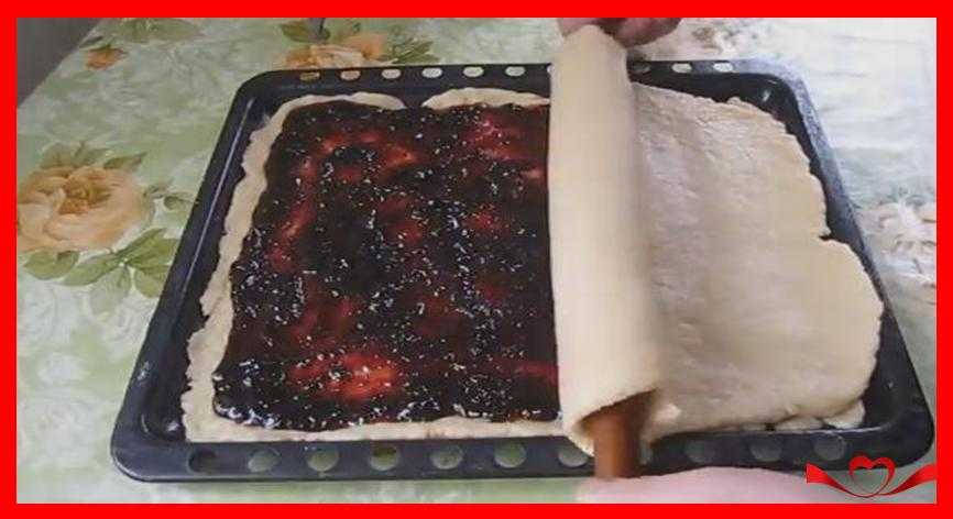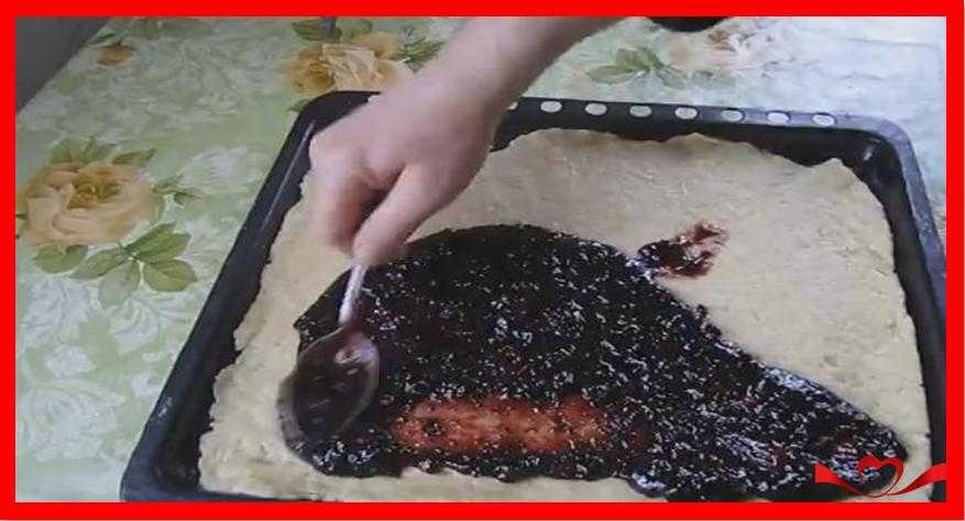 10. Возьмите второй кусок теста и раскатайте скалкой, а потом положите сверху на варенье. Или можно тесто потереть на терке. Здесь, для разнообразия показываю вариант цельного раскатанного куска.