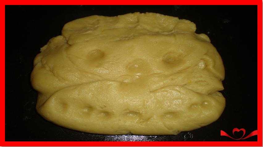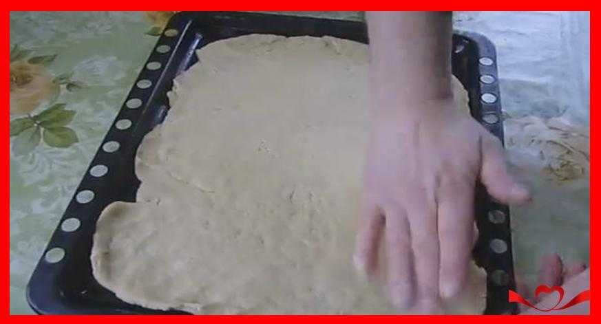 7. Одну часть теста при помощи скалки раскатайте и уложите на противень. Пальчиками хорошо разгладьте тесто по противню и сделайте по периметру небольшие бортики.
