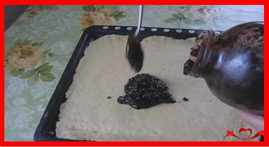 8. Теперь пришло время варенья. Налейте варенье на тесто. Если варенье жидковатое, то потрусите немного крахмала на него. Варенье можно взять смородиновое или абрикосовое. На мой взгляд лучше смородиновое, оно дает кислинку.