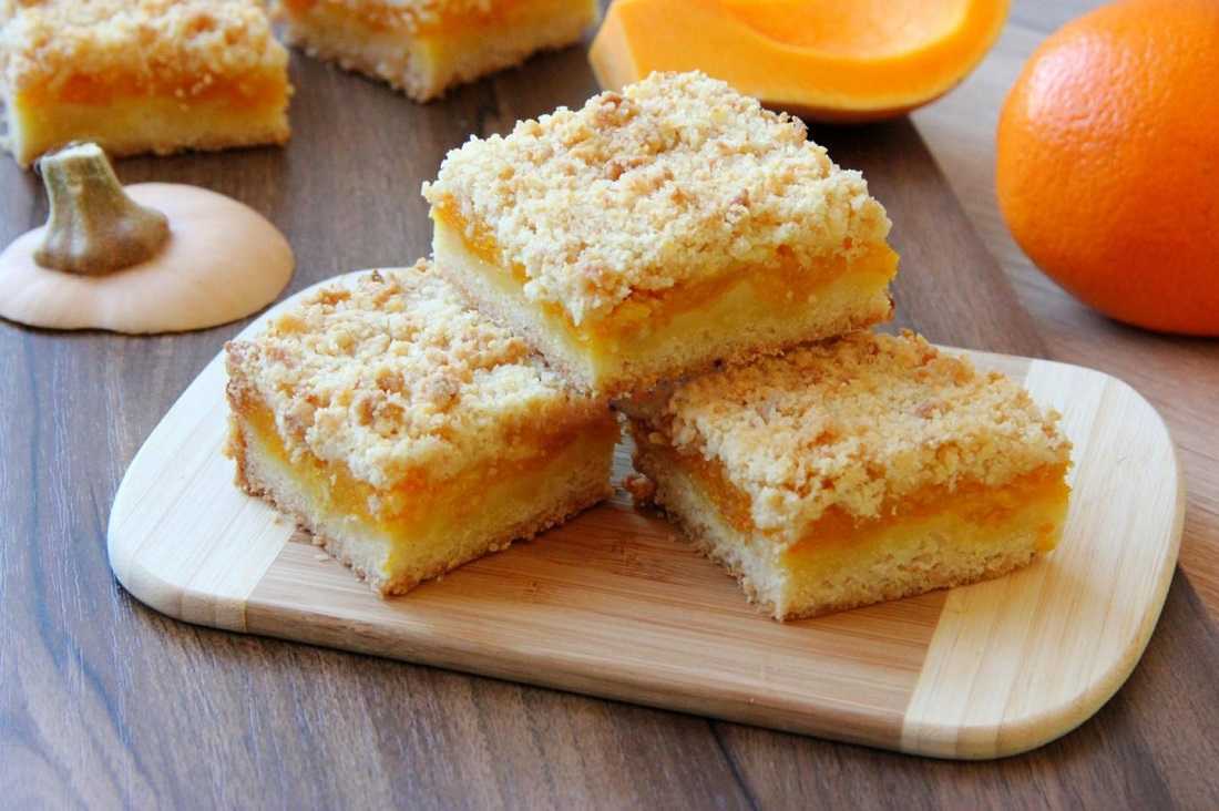 Форму смазывают маргарином и выкладывают на дно основу, делают невысокие бортики. Внутрь выкладывают начинку, сначала творожную, затем тыквенную, чередуя слои. При помощи вилки разравнивают и делают узоры. Выпекают пирог в духовке при 180 °C до готовности, которую определяют зубочисткой (нужно, чтобы тесто не оставалось на палочке). Остывший десерт подают к столу.