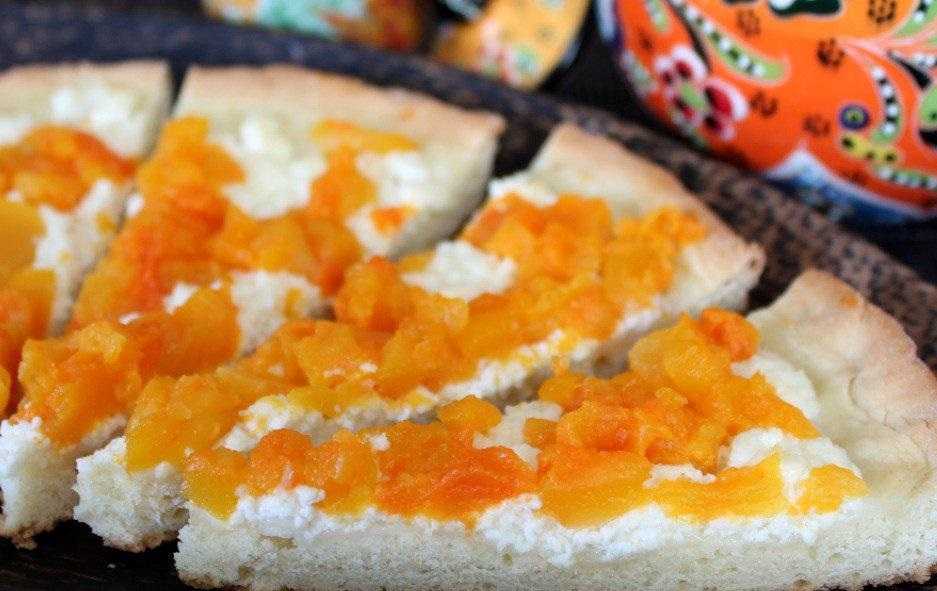 Творог смешивают с яйцом, корицей, сахаром, крахмалом, ванилином и сметаной. При помощи блендера перебивают в однородную массу. То же самое проделывают с курагой и тыквой, добавляют оставшиеся ингредиенты и перемешивают до однородной консистенции. Тесто достают из холодильника и раскатывают.