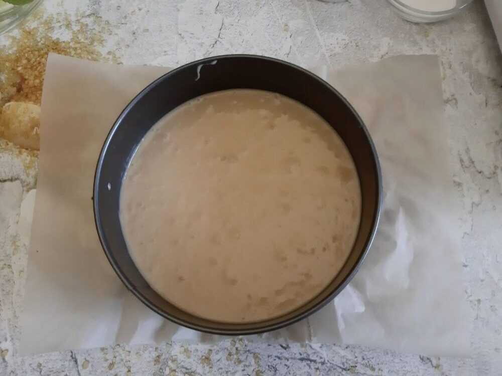 - Уложите в промасленную форму и сделайте бортики чуть выше, чем у формы (минимум 3 сантиметра).