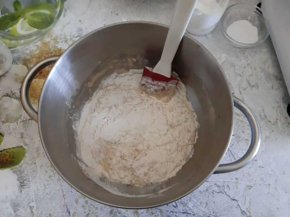 Завершаем сбор ингредиентов для теста просеянной мукой с разрыхлителем.