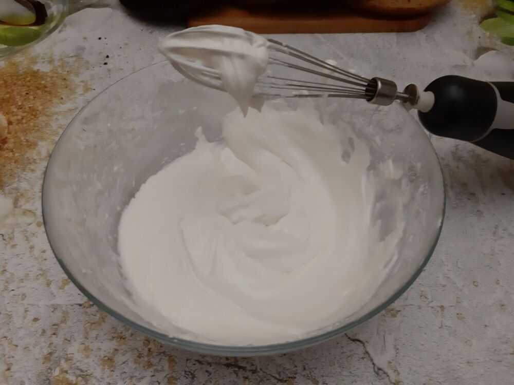 14. Отвешенный продукт соединяем с сахарной пудрой. Взбиваем до средних пиков. Получается достаточно густая сладкая масса, не стекающая с венчика.