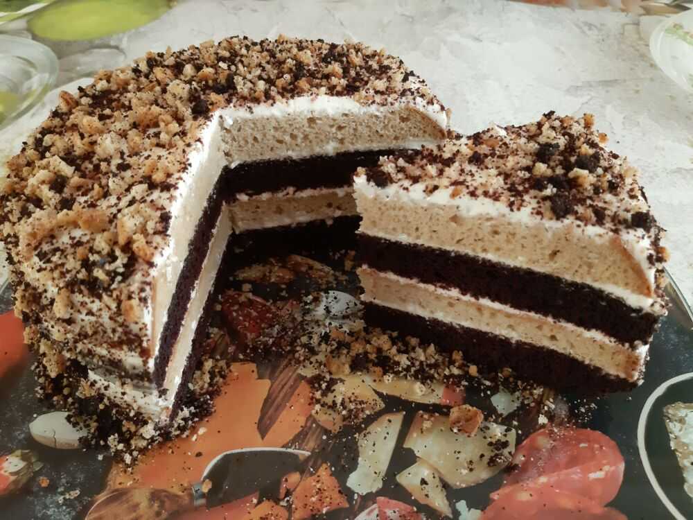 15. Собираем торт, чередуя коржи по цвету с щедрым слоем крема между ними.