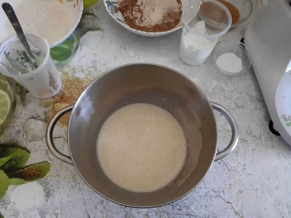 - Молоко подогреваем. Добавляем полную ложку сахара, щепотку соли, дрожжи, 50 г любого масла, а затем и муку.