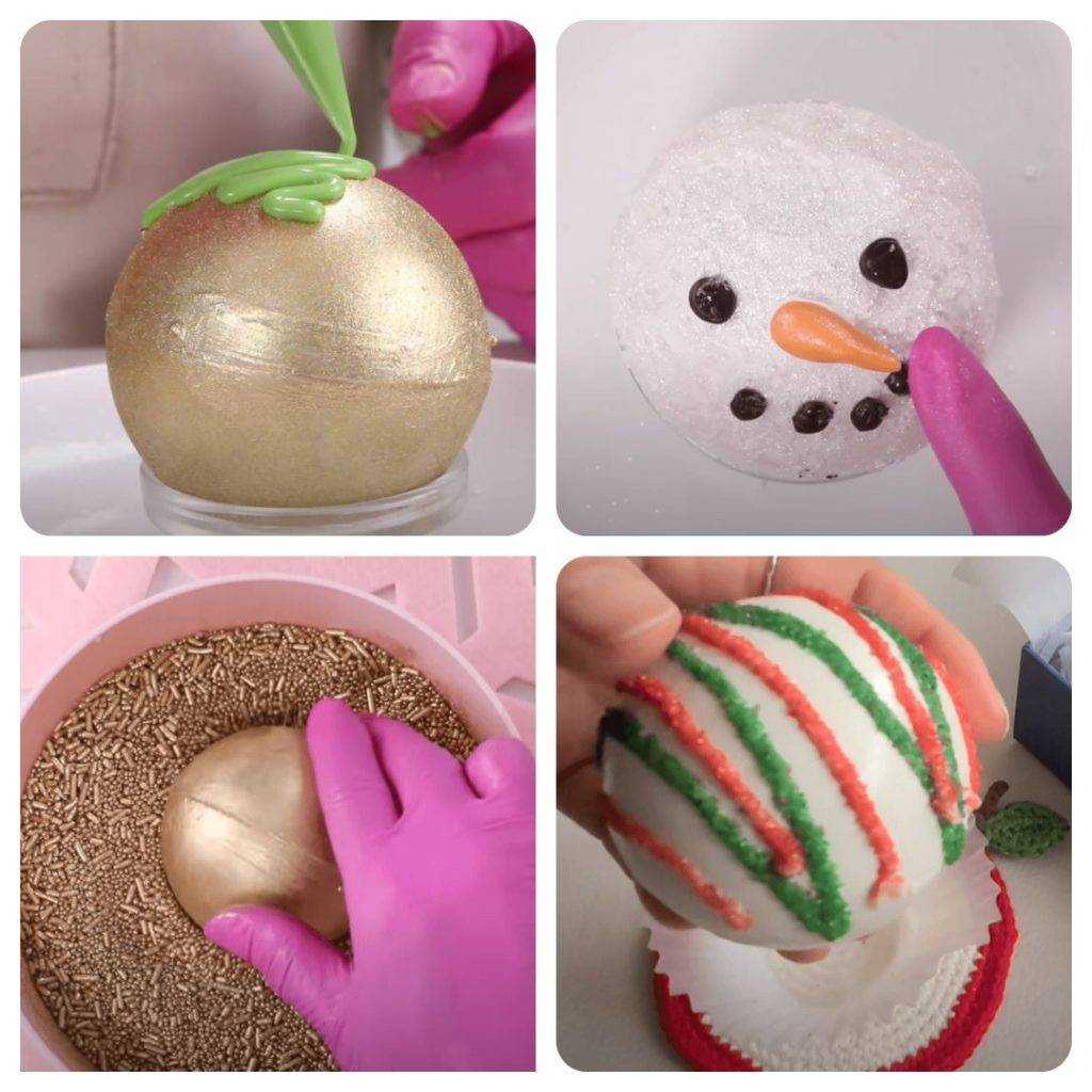 Готовые мячи из шоколада, с игрушками внутри, выглядят изумительно, если их покрывают кандурином с серебристым, перламутровым, золотистым отливом.