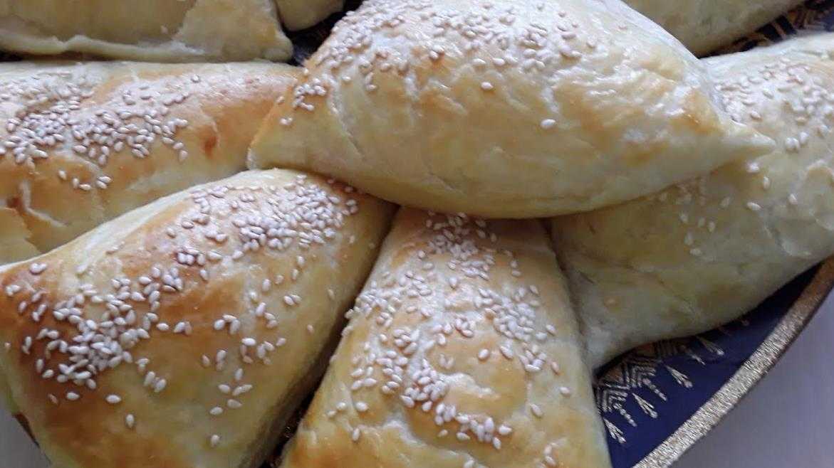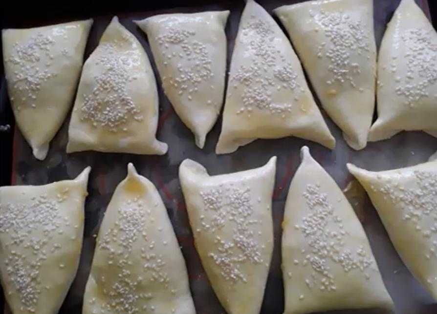 Сформировать из лепешек и начинки треугольные пирожки. Смазать поверхность взбитым яйцом при помощи кулинарной кисточки, посыпать кунжутом. Поместить в духовку на 25 минут, установив температурный режим в 180 градусов.