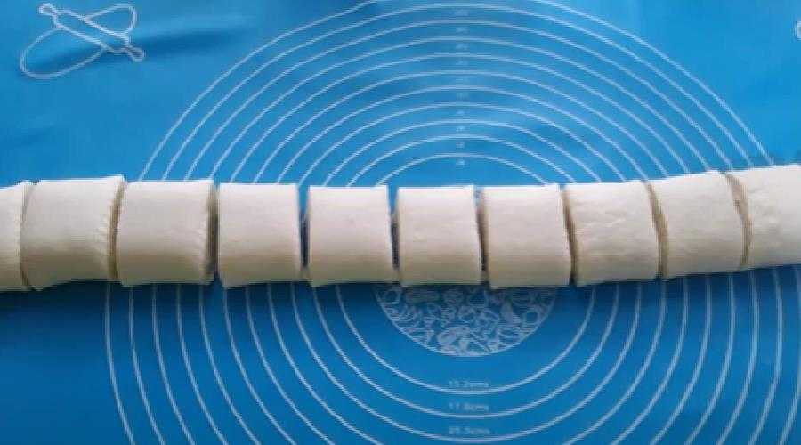Раскатать тесто в прямоугольник, толщина которого не превышает 7 миллиметров. Завернуть рулетом, нарезать поперек на шайбы.
