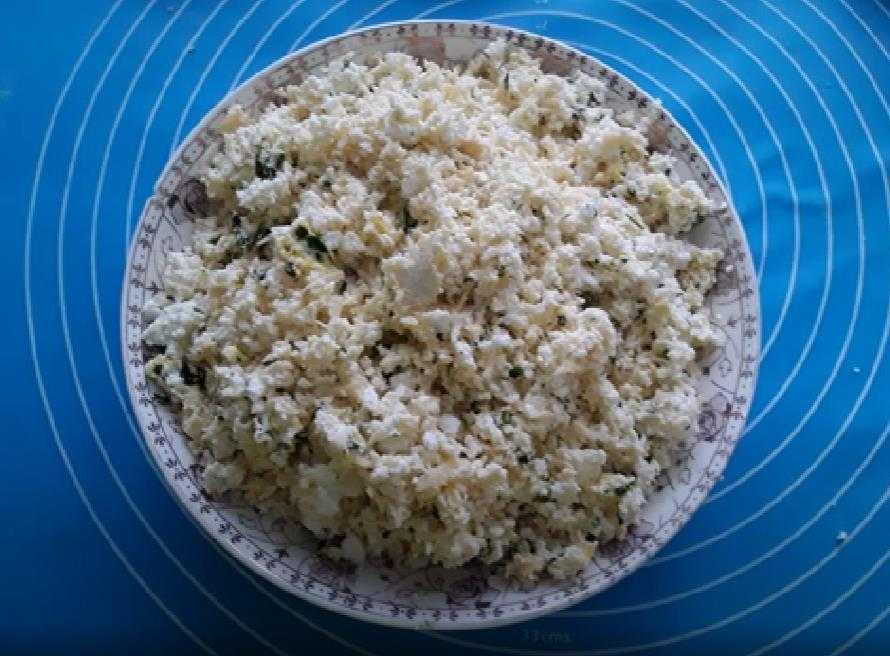 Твердый сыр натереть на средней терке, смешать с творогом. Добавить в начинку яйцо и мелко нашинкованную зелень. При необходимости посолить и аккуратно перемешать.
