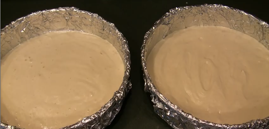 Собираем торт в разъемной форме. Выкладываем массу из печенья внутрь, распределяем ровным слоем. Отправляем форму в морозильник на 5 минут.