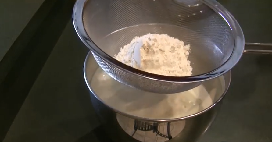 Пшеничную муку введите частями, каждый раз, тщательно перемешивая, чтобы не остались мучные комочки.