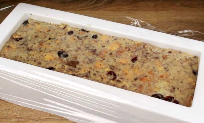 Оберните десерт пищевой пленкой и поместите в холодильник для охлаждения. Я оставляю десерт на ночь, для того чтобы он настоялся, но для того чтобы десерт застыл и уверенно сохранял форму, достаточно и нескольких часов.