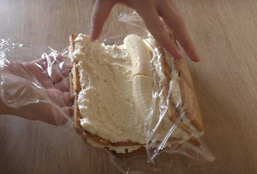 Бананы слегка придавливаем и теперь приподнимаем, соединяем два края вместе, печенье складывается и формируется домик. Закручиваем концы с двух сторон, сверху также прикрываем, чтобы десерт не заветривался и ставим, его в холодильник на полтора-два часа или в морозилку на 20 минут. Забегая вперед, хочу сразу сказать, что на следующий день десерт, становится еще вкусней. Разворачиваем фольгу и переносим аккуратно на противень или тарелку подходящего размера, он легко отклеивается и не деформируется.