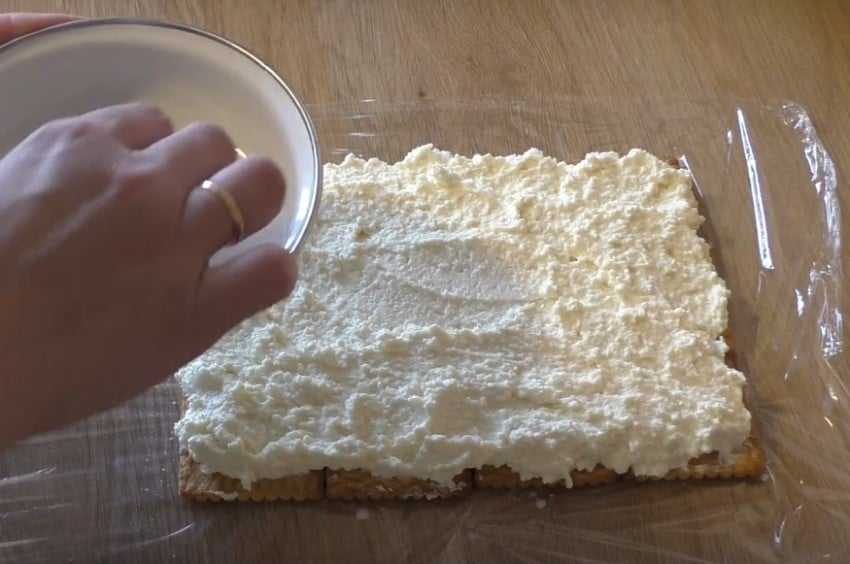 3. По первому слою печенья распределите чуть больше половины творожного крема.