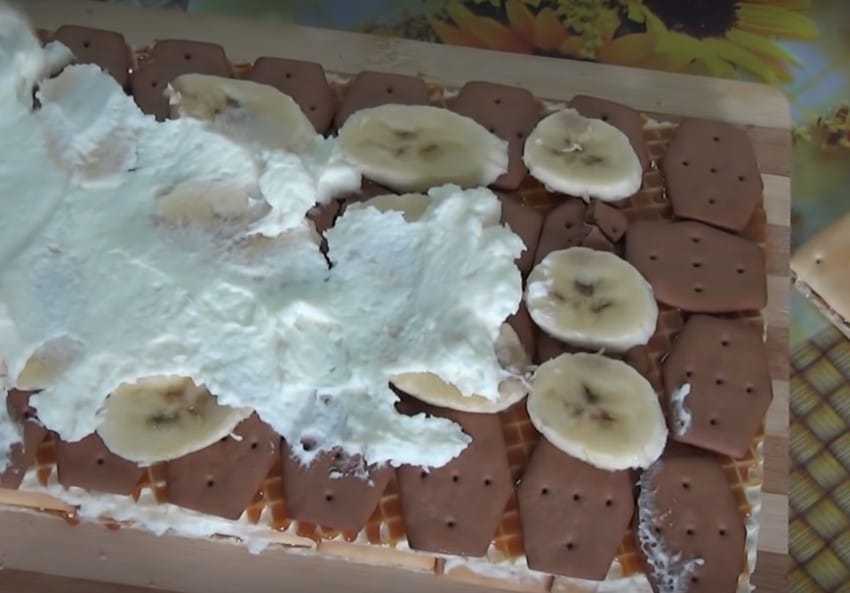 6. Смажьте бананы слоем крема, добавьте слой батона и хорошо прижмите ладонями. Завершите приготовление, хорошо смазав тортик сметанным кремом.