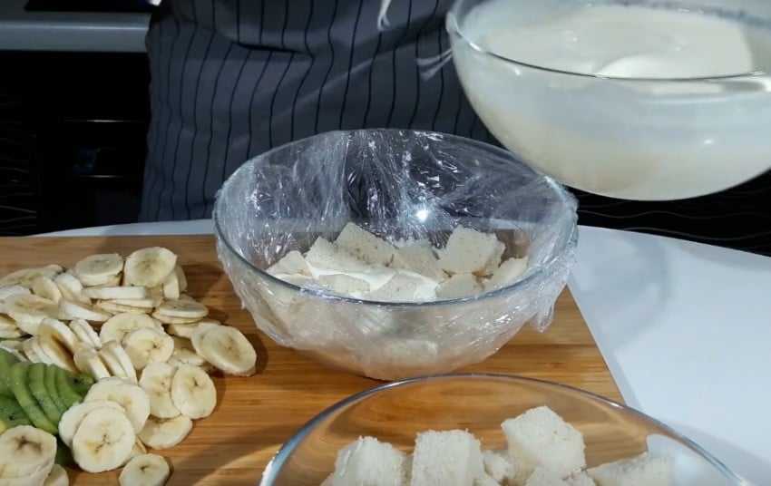4. Пищевой пленкой выстелите дно блюда, в котором будете собирать торт. Первым слоем промажьте дно сметанным кремом, затем плотно уложите кусочки батона и снова полейте сметаной.