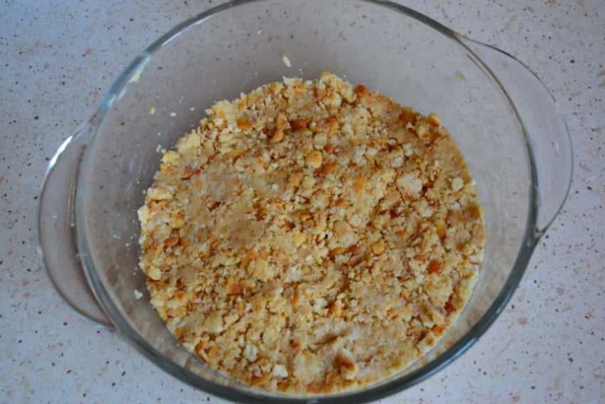 Наносим на корж часть крема. Для удобства я взвешивала каждую порцию из расчета, что нужно прослоить 5 коржей и оставить немного для боков заготовки. На каждый слой мне понадобилось 80 граммов крема. Остатками крема покрываем бока торта. Тут удобнее всего воспользоваться вращающимся столиком, если у вас такой есть. Переносим заготовку в холодильник, чтобы крем схватился так удобнее наносить песочную крошку.
