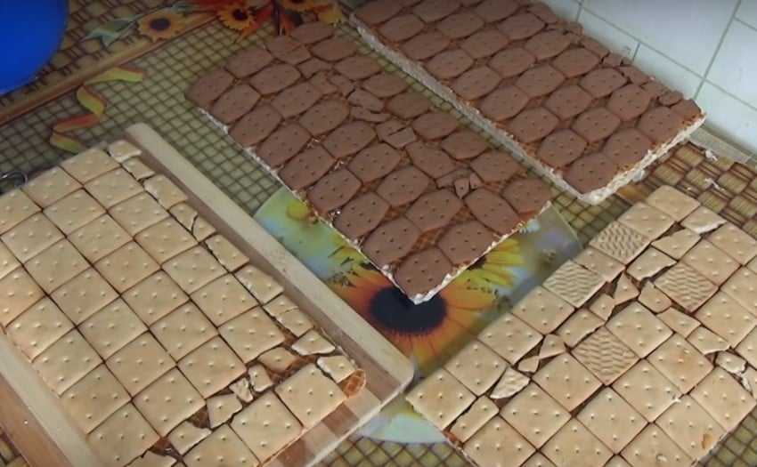 2. Достаньте 4-5 шт. коржей из упаковки, хорошо смажьте каждый слоем вареной сгущенки. Сверху каждого промазанного коржа разложите печенье.