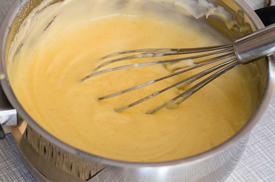 – плотность обычного заварного крема зависит от количества муки, то есть «чем больше, тем гуще», но много класть тоже не стоит, иначе смесь будет напоминать сбившуюся в комки манную кашу;