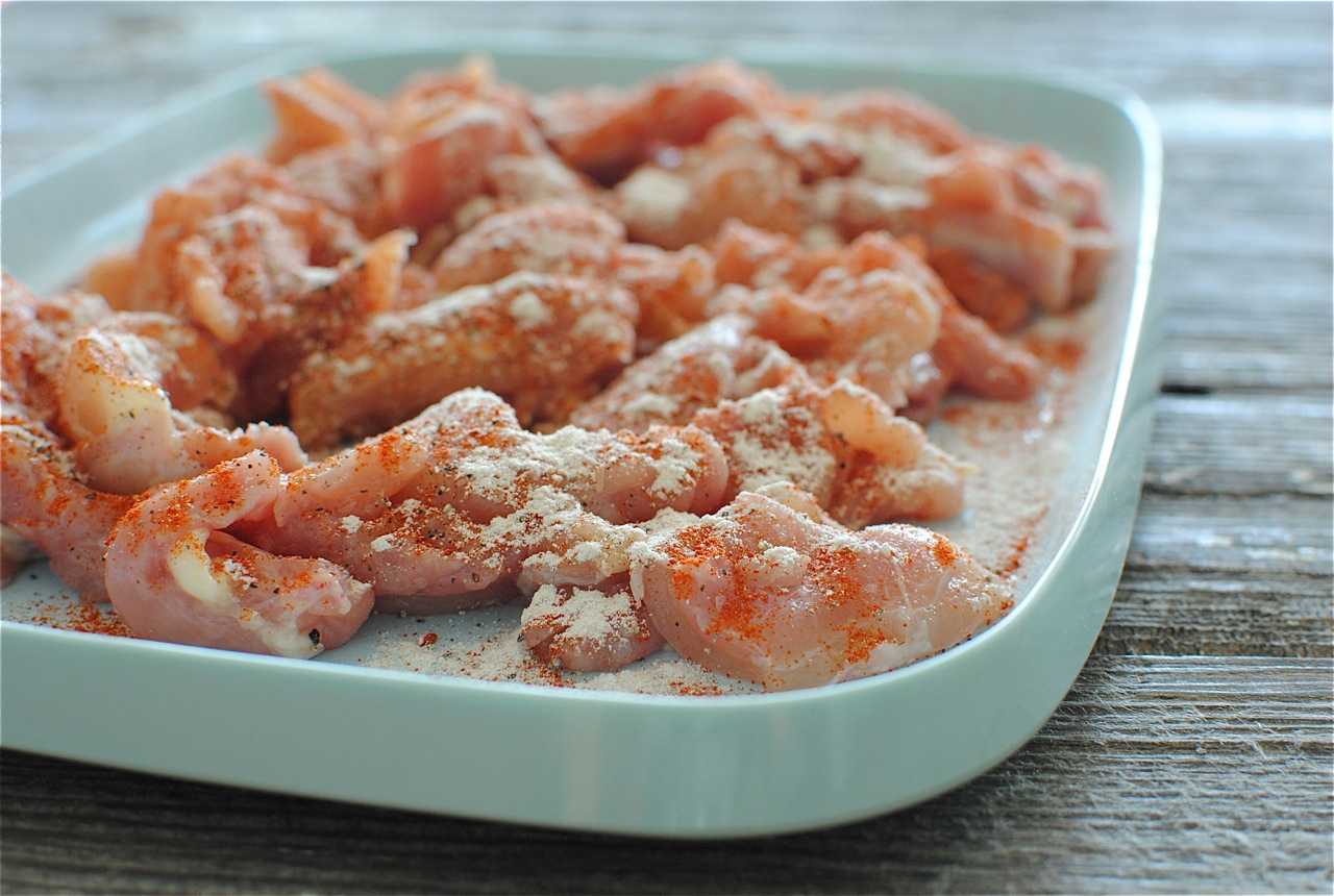 - Посолить и приправить свинину специями, добавить горчицу, перемешать и оставить мариноваться минимум на 25 минут;