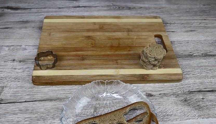 - Хлеб нарезаем на одинаковые кусочки, по возможности делая ему разную форму (звезды, круга, квадрата). Это придаст закуске изысканного внешнего вида, а мастерство и не банальность оформления удивит ваших гостей.