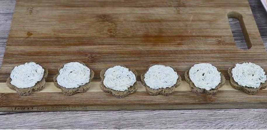 - На поджаренный хлеб намазываем творожную массу, смешанную с укропом.