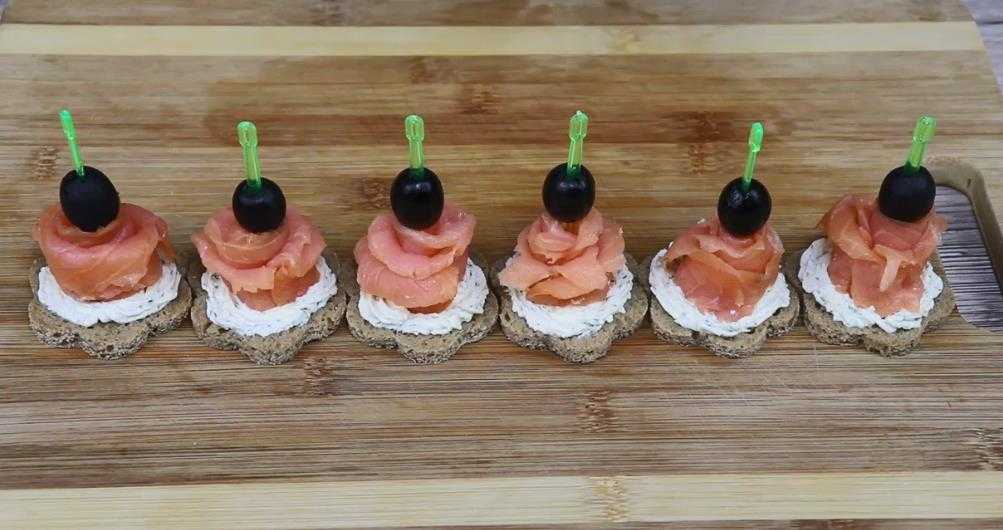 - Делаем второй вид канапе — кусочки семги смазываем плавленным сыром, сворачиваем рулетом, и нанизываем на кусочки хлеба вместе с маслинами.
