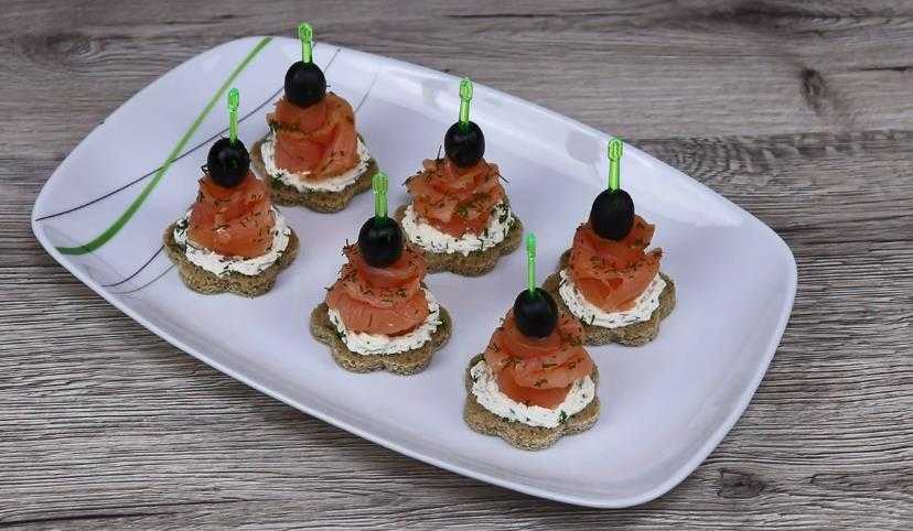 С новогоднего стола маленькие канапе разлетаются за несколько минут, потому что они легко помещаются в рот целиком. На празднике они выделяются многоэтажностью и роскошным декорированием. Канапе с красной рыбой фиксируется при помощи разноцветных шпажек, поэтому их можно употреблять в пищу, не снимая с фиксатора.