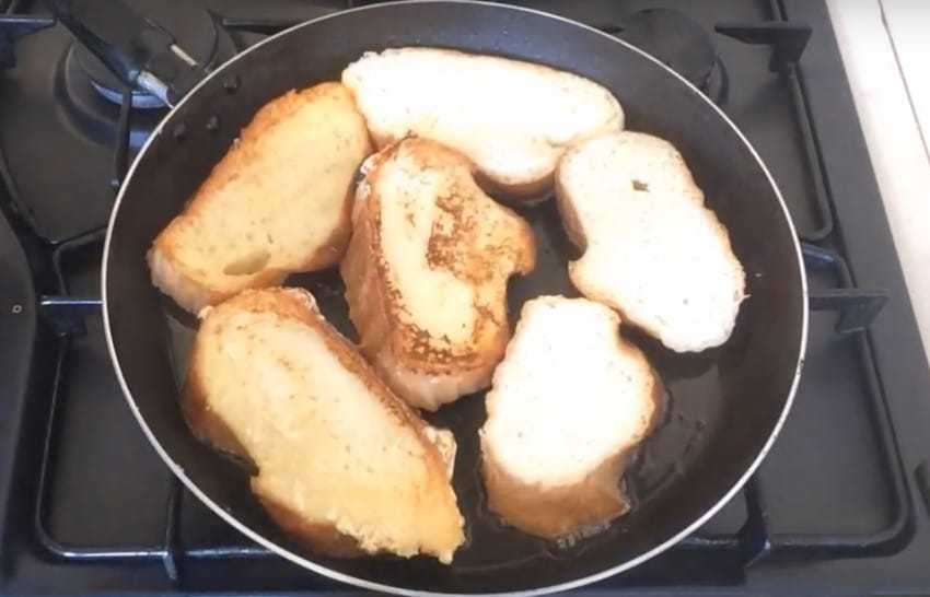 - Полученную смесь отправить на сковороду и немного обжарить. Выложить на нее кусочки багета, пропитать их с каждой стороны смесью и обжарить до золотистой корочки.