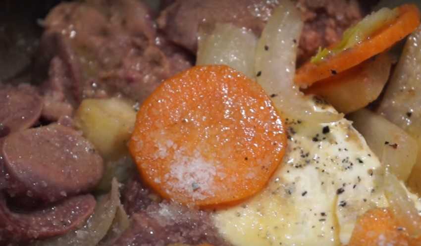 - В форму заложить все ингредиенты с салом, закрыть крышкой, запекать в духовке час при температуре 185 градусов.