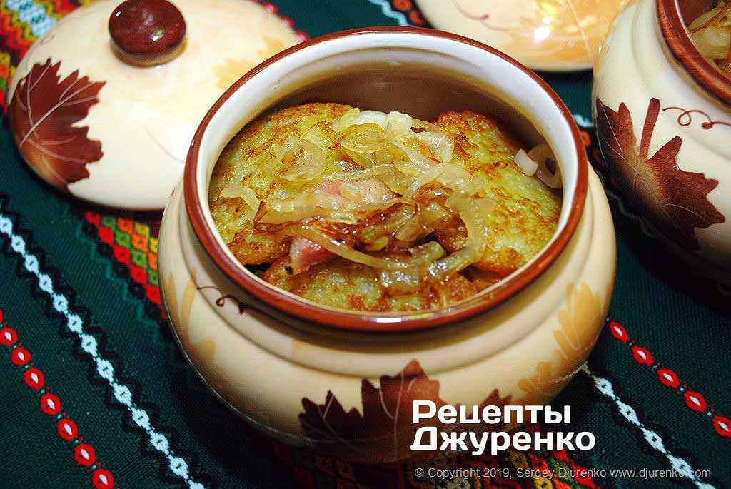 Из 1 кг картофеля можно пожарить более 20 блинчиков. Понадобятся небольшие керамические или глиняные горшочки. Перекладывая блинчики шкварками и жареным луком, заполнить горшочки. Необязательно это делать «доверху». Очень часто в горшочки добавляют сметану, сливки, жареные грибы или морковку – это дело вкуса. Накрыть горшочки крышками и поставить в духовку, разогретую до 180-200 градусов, на 20-30 мин.