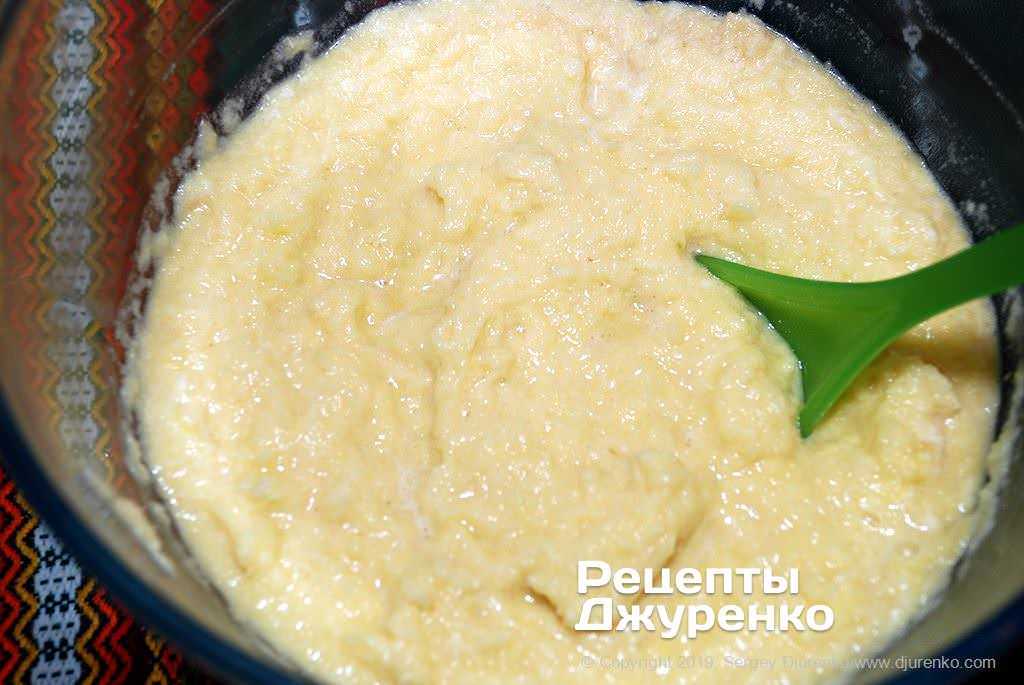 - Молоко требуется подогреть до тёплого состояния и влить к основной массе, всё тщательно взбить миксером на малых или средних оборотах.