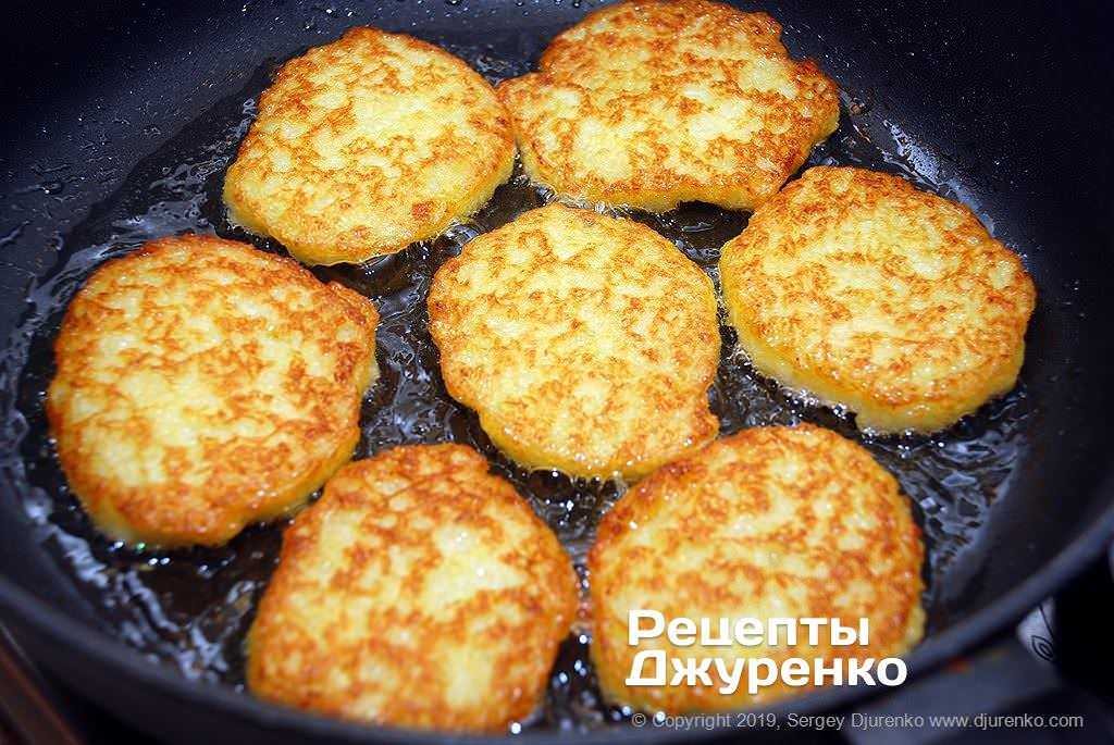 - Обжарить драники в разогретом масле на малом огне, накрыв сковороду крышкой с пароотводом. Поскольку внутри мясо, заготовки должны готовиться не менее 10 минут (в общей сложности).