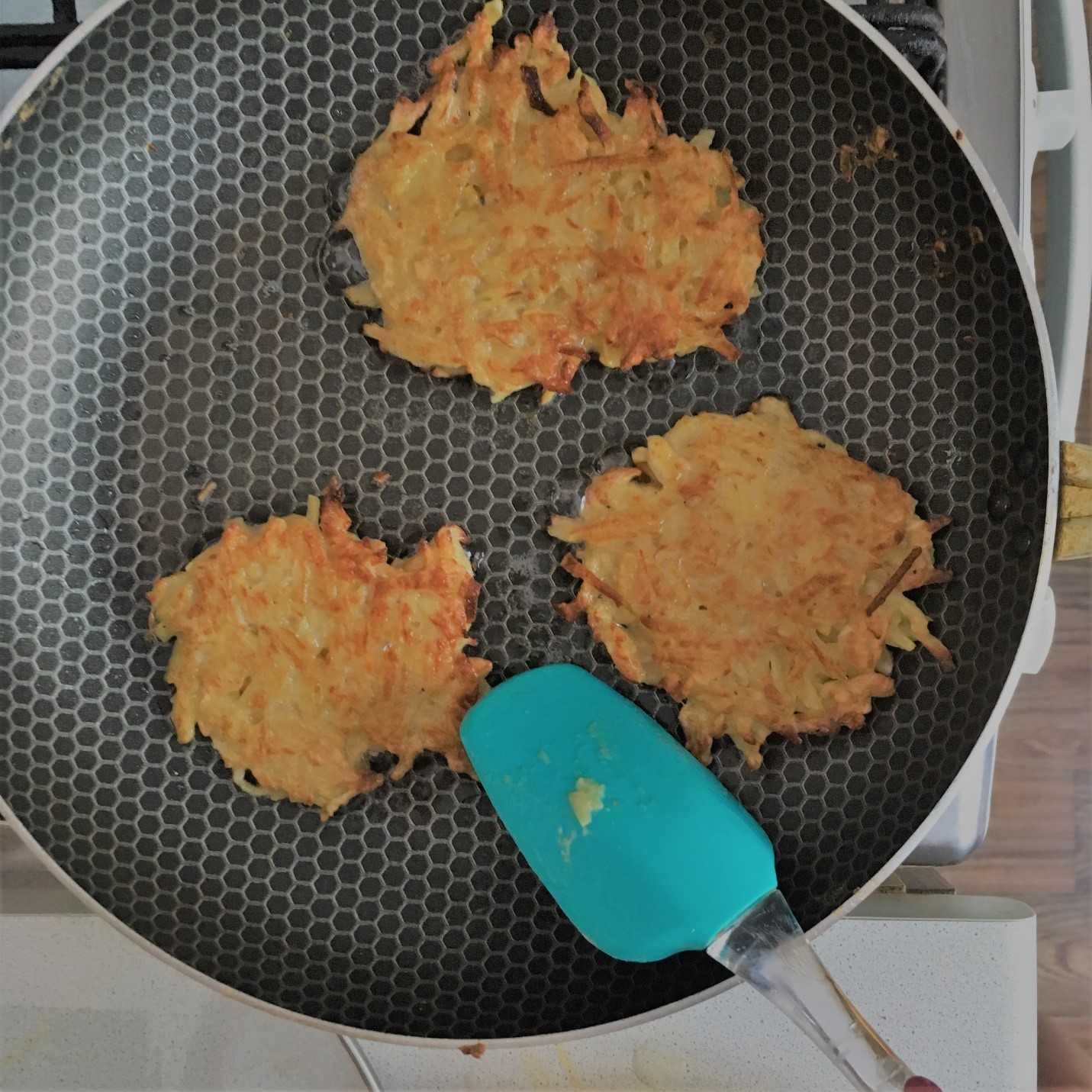 Будьте внимательны и осторожны, драники очень тяжело переворачиваются из-за своей легкости и нежности! Переворачивать нужно с помощью лопатки или даже двух.