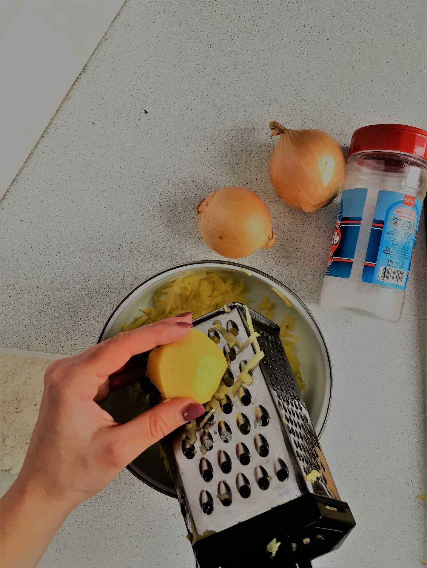 - «Драть» овощ следует на мелкой терке вместе с луком. В конечном итоге масса не станет темной.