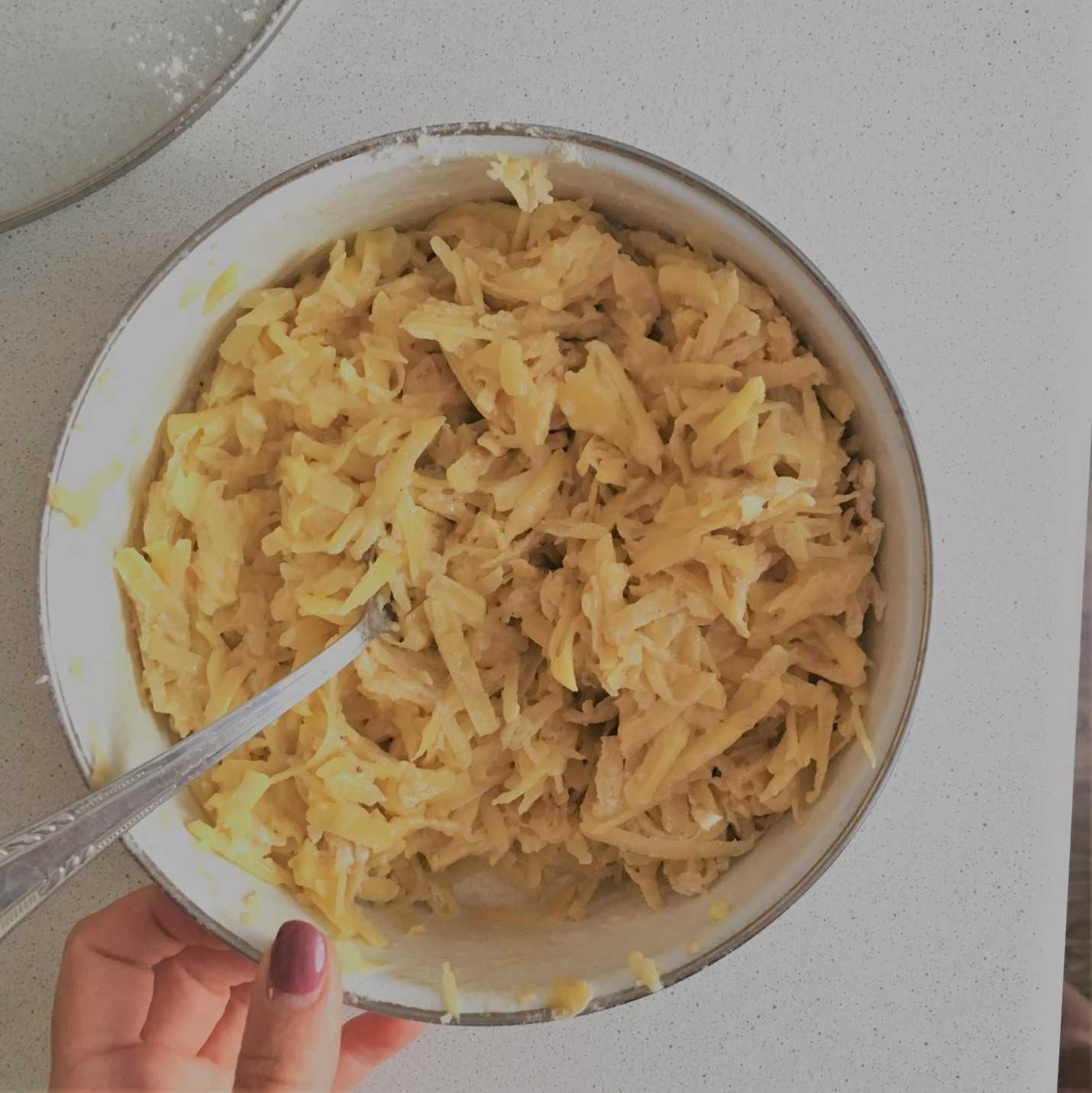 Набор продуктов такой же, как и на классические драники, но к ним добавляется тертый сыр. Например, можно взять голландский.