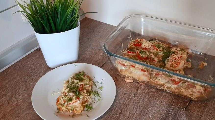 Подавать на стол рыбу следует в порционном виде, посыпав ее укропом. Дополнительный гарнир для блюда не потребуется, но можно украсить его колечками маслин, зеленым салатом, консервированным горошком.